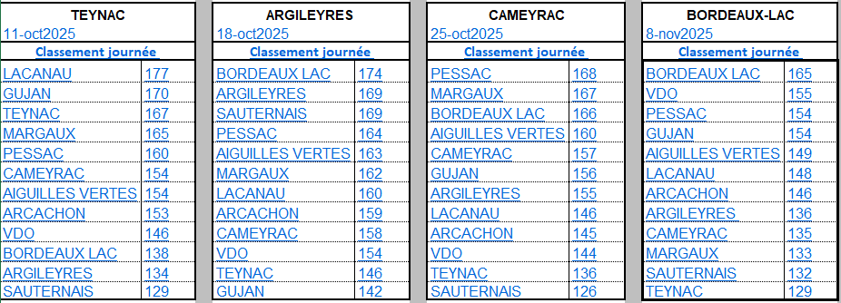 L’Interclubs d’Hiver en net se déroule sur les golfs de Gironde le samedi d’Octobre 2025 à Mars 2026.